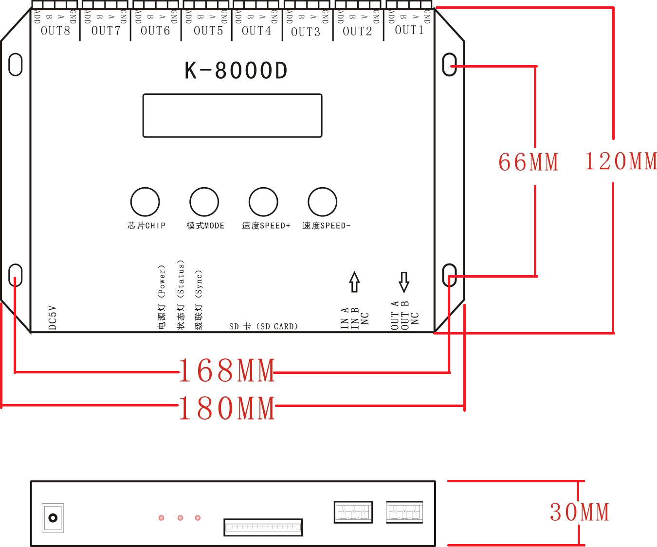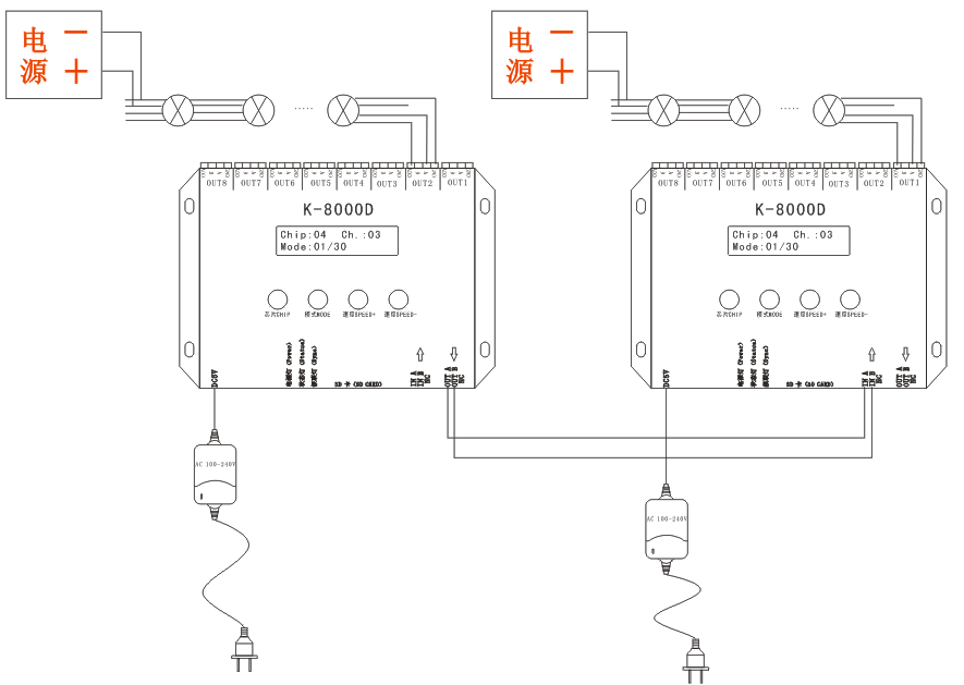 3、控制器8个端口输出,每个端口最大可带512灯。